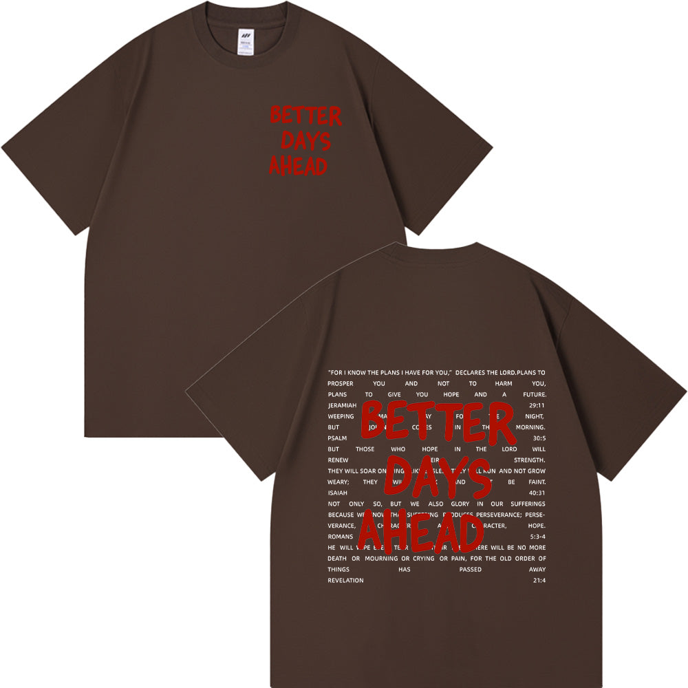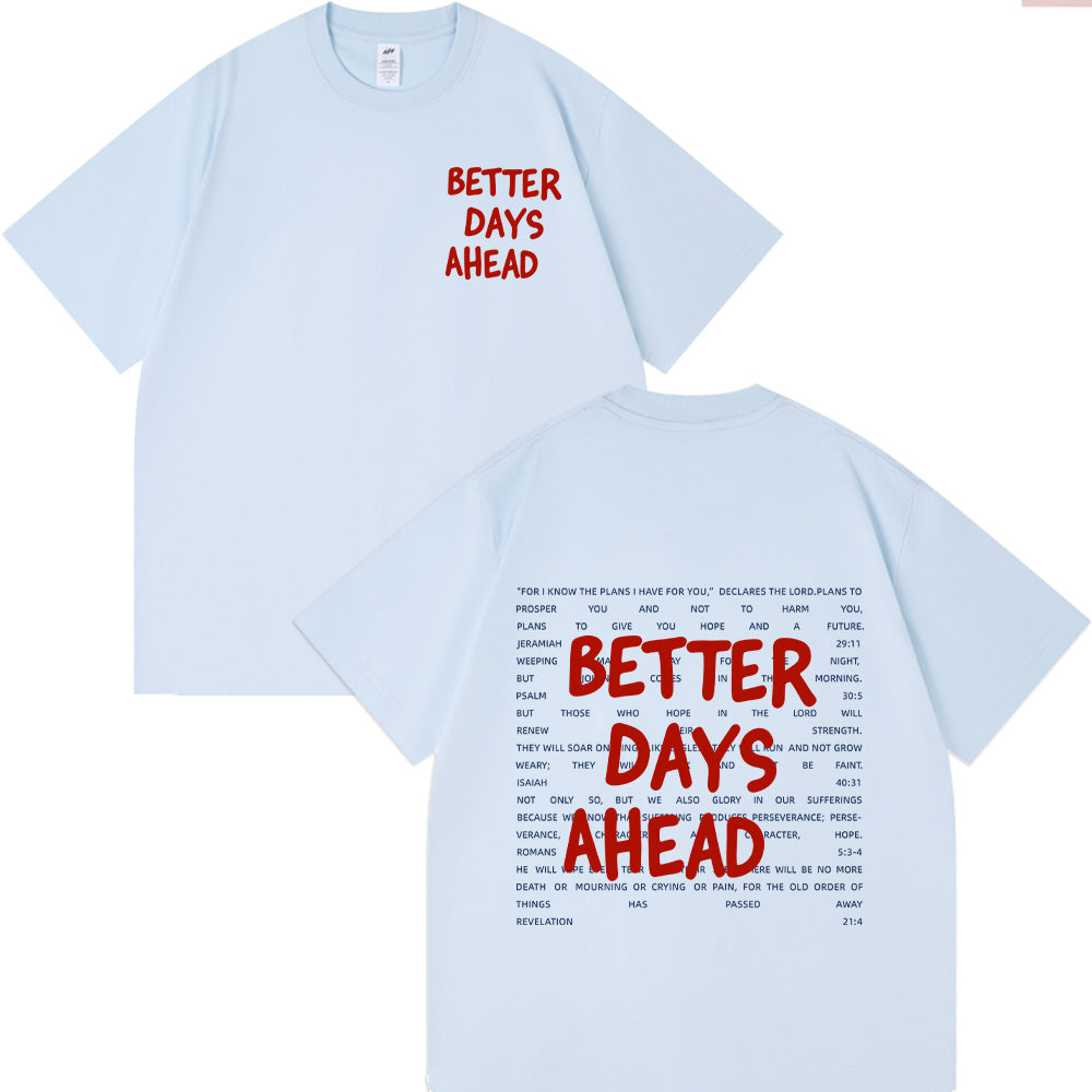 Embrace a hopeful reminder with the “Better Days Ahead” Christian Unisex Cotton T-shirt. Made from soft cotton, it features a simple front phrase and a bold back design surrounded by encouraging scriptures. This comforting tee points you to God’s promises of hope, helping you stay steady through hard moments with the assurance that brighter days are ahead.