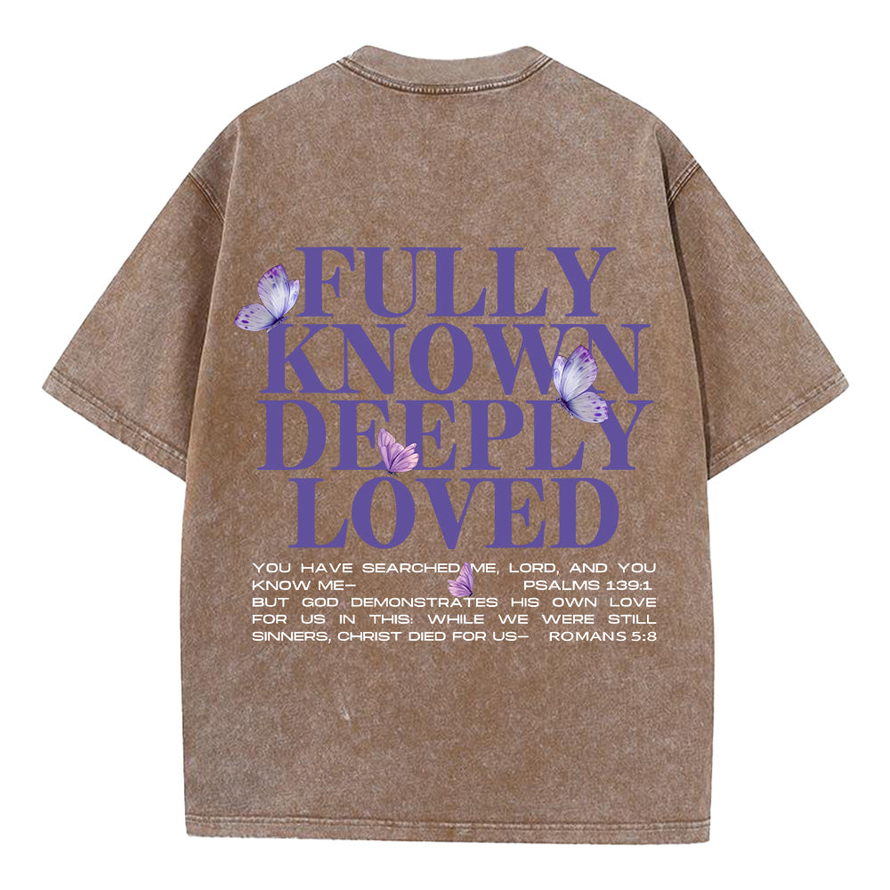 Embrace the heartfelt faith reminder with the "Fully Known Deeply Loved" Washed Unisex T-Shirt. Featuring delicate butterfly graphics, bold "Fully Known Deeply Loved" messaging, this soft washed tee reminds us that faith is a profound assurance of being fully known and deeply loved by God—affirming His intimate knowledge of us and His sacrificial love demonstrated while we were still sinners.