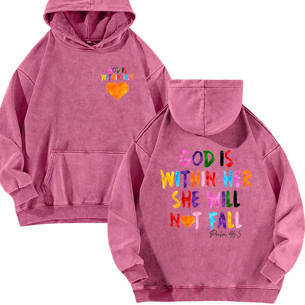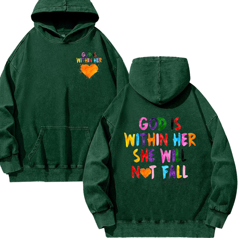 Introducing our "God Is Within Her" Unisex Washed Hoodie, featuring a vibrant, multi-hued graphic with the message "GOD IS WITHIN HER SHE WILL NOT FALL" on the back and a matching heart-accented design on the front, it serves as a daily reminder of spiritual resilience and divine presence.It offers a snug fit, a hood for extra warmth, and a vintage, worn-in feel, making it a warm and meaningful choice for anyone seeking to embrace their faith with both comfort and stylish expression.