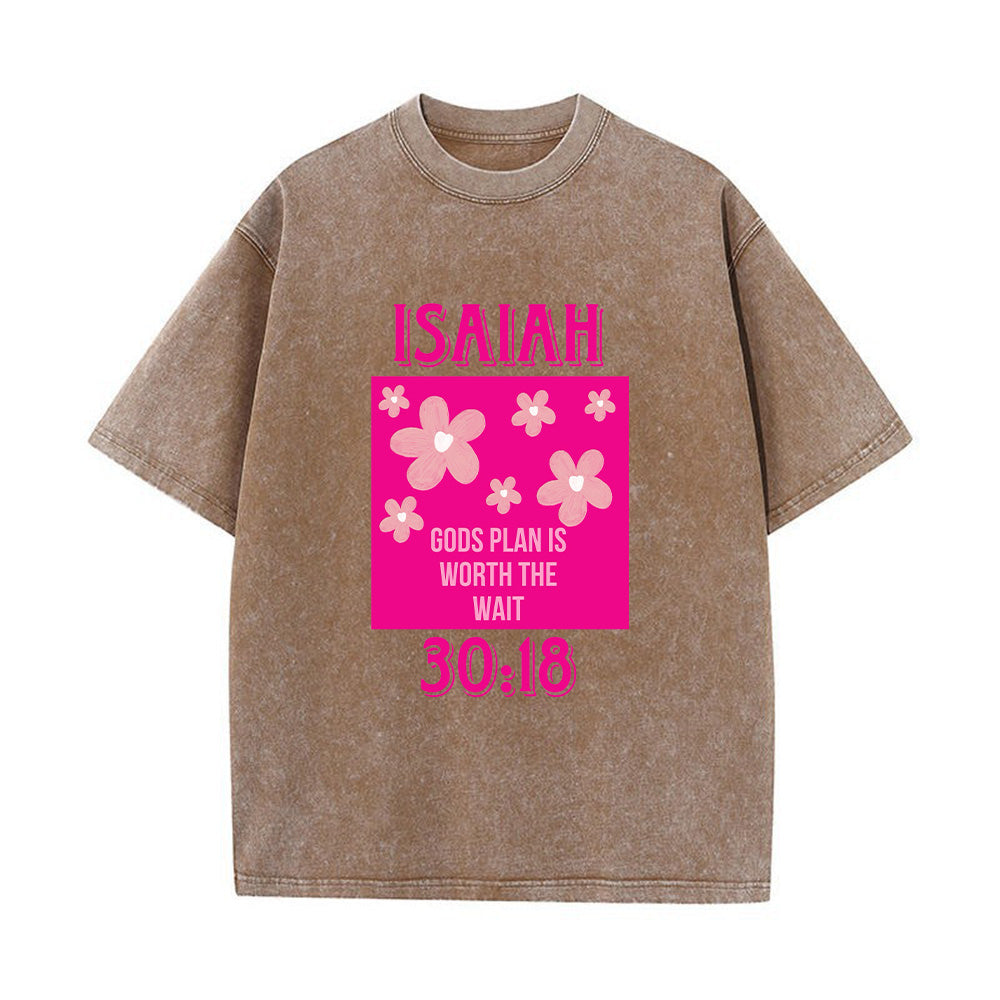 Embrace a hopeful faith reminder with the “God's Plan Is Worth The Wait” Unisex Washed T-Shirt. Made from soft, washed cotton, it features “ISAIAH 30:18” alongside a pink square design with cute floral details and the phrase “GOD'S PLAN IS WORTH THE WAIT.” This gentle tee encourages trust in God’s timing and brings a warm, sweet, hope-filled vibe to your everyday wear.