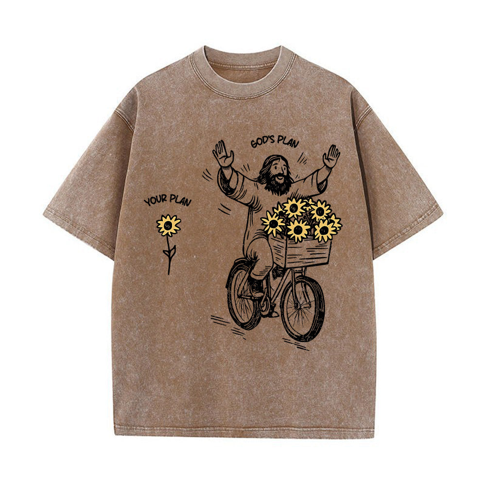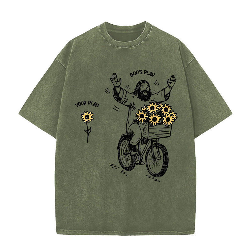 Crafted from soft combed cotton fabric, this casual essential offers a relaxed fit and a vintage, worn-in feel. Featuring a whimsical graphic that contrasts "YOUR PLAN" with a single sunflower and "GOD'S PLAN" with a figure riding a bike loaded with sunflowers, it combines spiritual significance and playful artistry, making it a go-to choice for any occasion.