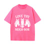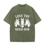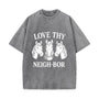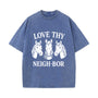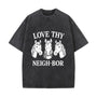 Embrace the faith reminder with the "Love Thy Neighbor Christian" Unisex Washed T-Shirt. Featuring adorable graphics of three horse heads, plus the clever pun-filled "LOVE THY NEIGH-BOR" lettering, this soft washed tee reminds us of the core call to love our neighbors as ourselves—with a charming, lighthearted flair—stylish and faith-centered.