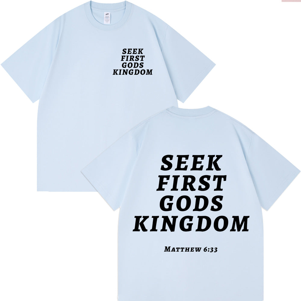 Embrace a purposeful faith reminder with the “Seek First God's Kingdom” Unisex Cotton T-shirt. Made from soft cotton, it features a simple front version of the phrase and bold lettering on the back with the Matthew 6:33 reference. This grounding tee encourages you to put God’s kingdom first and trust His provision, bringing a steady, purpose-filled vibe to everyday wear.