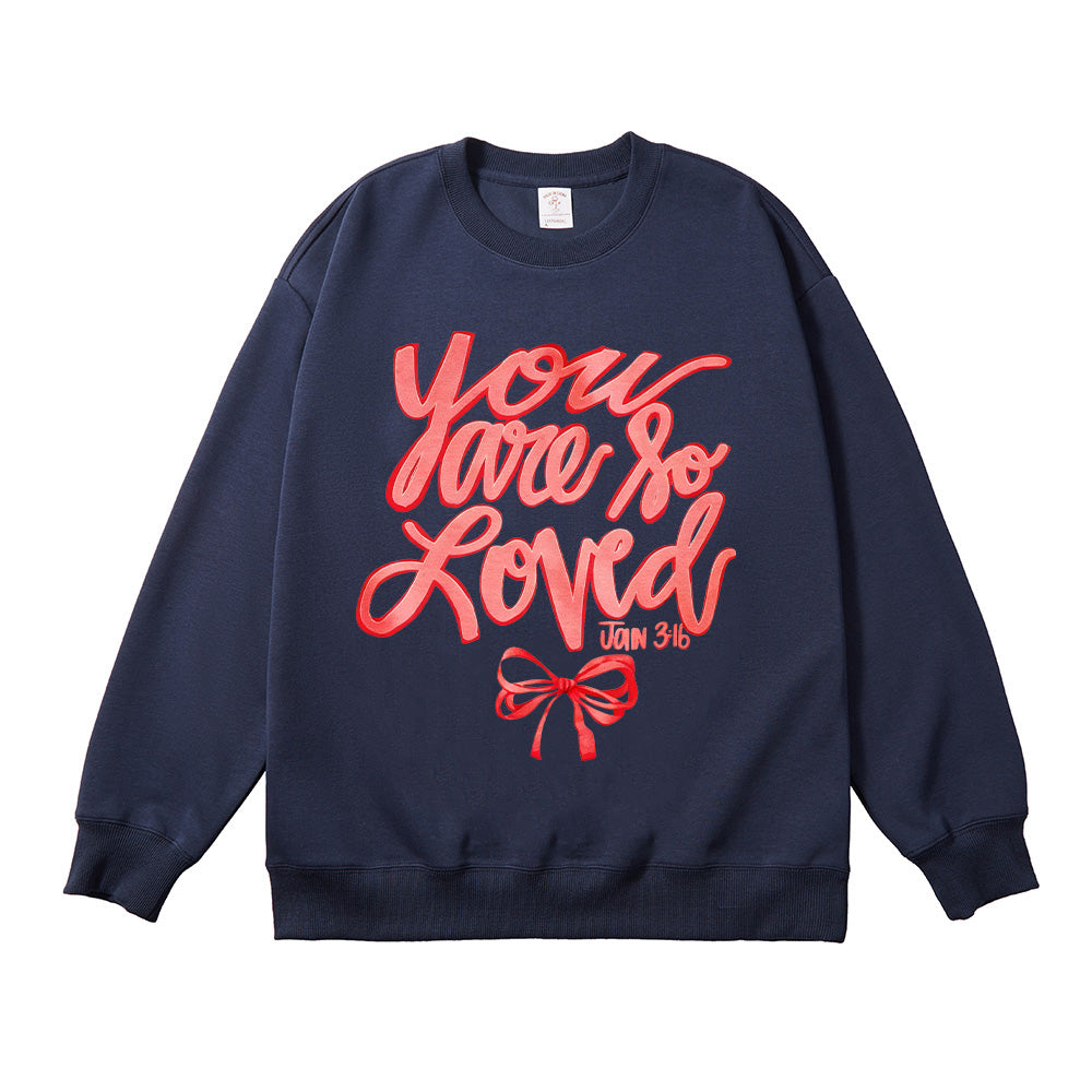 Embrace the heartfelt faith reminder with the "You are so Loved Bow" Unisex Cotton Sweatshirt. Featuring bold red script "You are so Loved", a delicate bow graphic, and the Scripture reference John 3:16, this soft cotton sweatshirt reminds us that faith is a tender assurance of God’s unconditional love, rooted in the timeless truth that we are cherished beyond measure through His sacrifice.